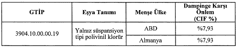 MADDE 1 – (1) Bu Tebliğin amacı, 24/6/2020 tarihli ve 31165 sayılı Resmî Gazete’de yayımlanan İthalatta Haksız Rekabetin Önlenmesine İlişkin Tebliğ (Tebliğ No: 2020/11) ile Amerika Birleşik Devletleri ve Almanya Federal Cumhuriyeti menşeli 3904.10.00.00.19 gümrük tarife istatistik pozisyonu altında yer alan “yalnız süspansiyon tipi polivinil klorür” ithalatına yönelik olarak başlatılan ve Ticaret Bakanlığı İthalat Genel Müdürlüğü tarafından yürütülen nihai gözden geçirme soruşturmasının tamamlanması neticesinde alınan kararın yürürlüğe konulmasıdır.